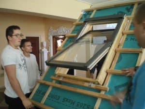 Po prezentacji teoretycznej instruktorzy firmy FAKRO przeprowadzili część praktyczną szkolenia w zakresie montażu okna dachowego.