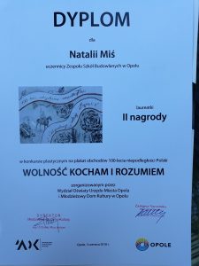 19 czerwca 2018 roku na placu Wolności w Opolu odbyło się uroczyste wręczenie dyplomów i nagród laureatom konkursu plastycznego w ramach obchodów 100 – lecia niepodległości Polski. Konkurs zorganizowany był pod hasłem „ Wolność kocham i rozumiem”, a skierowany był do uczniów opolskich szkół. Organizatorem był Wydział Oświaty Urzędu Miasta Opola i Młodzieżowy Dom Kultury. Uczniowie z naszej szkoły również wzięli udział w tym konkursie, a uczennica z klasy I TA – Natalia Miś zajęła II miejsce w kategorii szkół ponadgimnazjalnych.