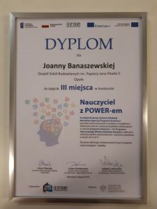 W ramach konferencji inaugurującej Europejski Tydzień Umiejętności Zawodowych 5 listopada 2018 roku w Warszawie, miała miejsce uroczystość wręczenia nagród w I edycji konkursu Nauczyciel z POWER-em. Miło nam poinformować, że nauczycielka Zespołu Szkół Budowlanych im. Papieża Jana Pawła II w Opolu, Joanna Banaszewska, otrzymała trzecią nagrodę w Polsce w kategorii Edukacja Zawodowa. Konkurs ten ma na celu wyróżnienie osób biorących udział w zagranicznych mobilnościach oraz promocję najciekawszych efektów projektów mobilności realizowanych przez beneficjentów Programu Erasmus+ i Programu Operacyjnego Wiedza Edukacja Rozwój w sektorach edukacja szkolna oraz kształcenie i szkolenia zawodowe w latach 2014-2017.