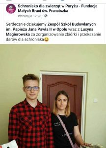 Z inicjatywy uczniów klasy 3TA z Zespołu Szkół Budowlanych w Opolu im. Papieża Jana Pawła II: Kamili Szymczak, Wiktorii Młyńskiej oraz Marcina Kinder zorganizowaliśmy  zbiórkę dla podopiecznych schroniska w Paryżu pod Opolem.