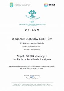 W dniu 03.06.2019r. w Parku Nadodrzańskim odbyło się plenerowe podsumowanie konkursów artystycznych i edukacyjnych zorganizowane przez opolskie szkoły i placówki oświatowe w roku szkolnym 2018/2019. Zespół Szkół Budowlanych im. Papieża Jana Pawła II w Opolu podczas 6 Gali Opolskich Ogrodów Talentów otrzymał dyplom z gratulacjami za osiągnięcia i podziękowaniami za zaangażowanie we wszechstronny rozwój uczniów!
