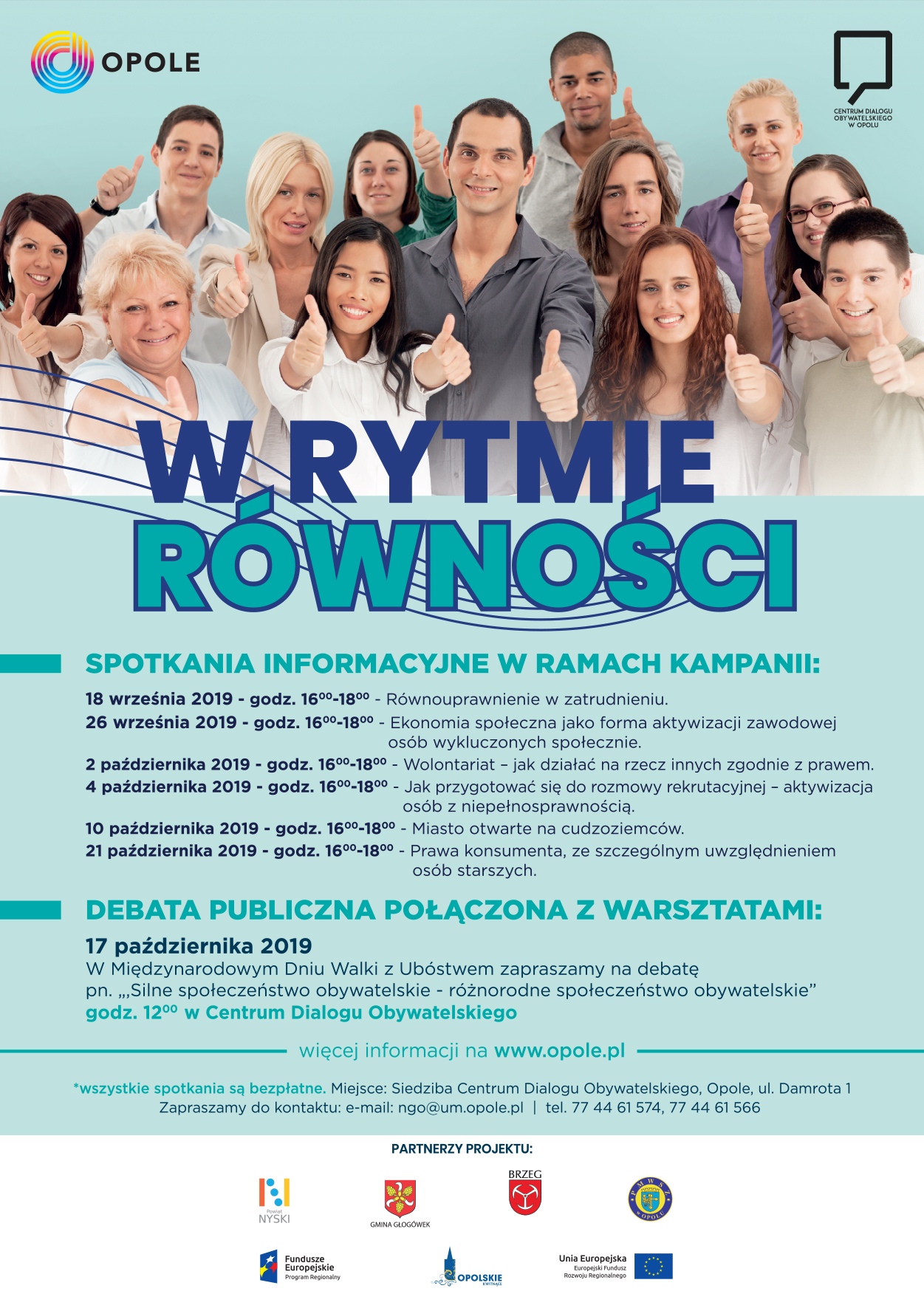 Miasto Opole wraz z partnerami – Powiatem nyskim, Gminą Głogówek, Gminą Brzeg oraz Państwową Medyczną Wyższą Szkołą Zawodową rozpoczęło realizację kampanii świadomościowej – W RYTMIE RÓWNOŚCI, która jest częścią projektu: „Aktywizacja części obszarów śródmieścia poprzez rewitalizację ul. Krakowskiej i obszarów przyległych w Opolu – II etap”