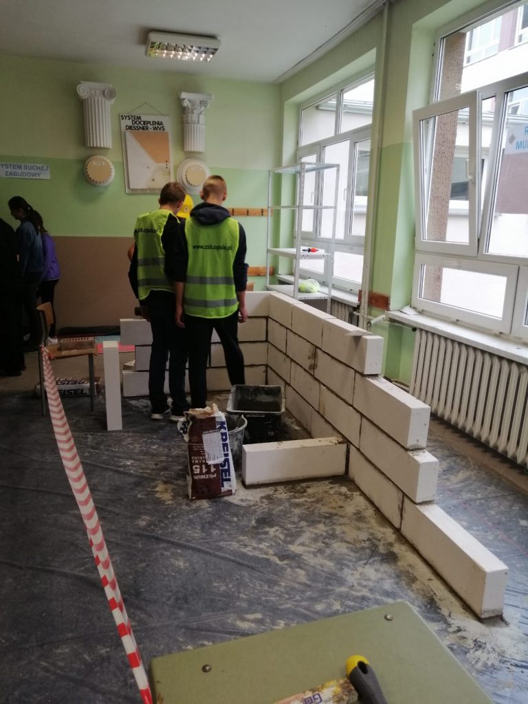 Budowlane uczniowie zostali zapoznani w sposób praktyczny z technikami nakładania powłok malarskich na płyty GKB, murowania prostych odcinków murów z bloczków z betonu komórkowego na zaprawie cementowo – wapiennej oraz montażu okładzin ściennych z płyt GKB.
