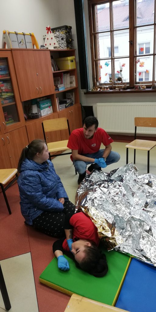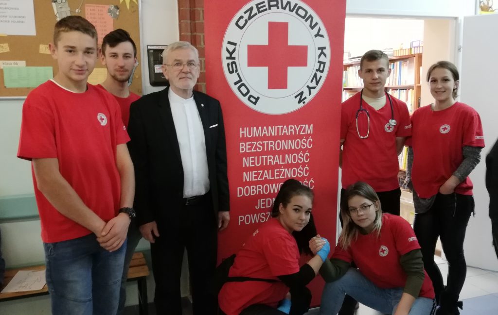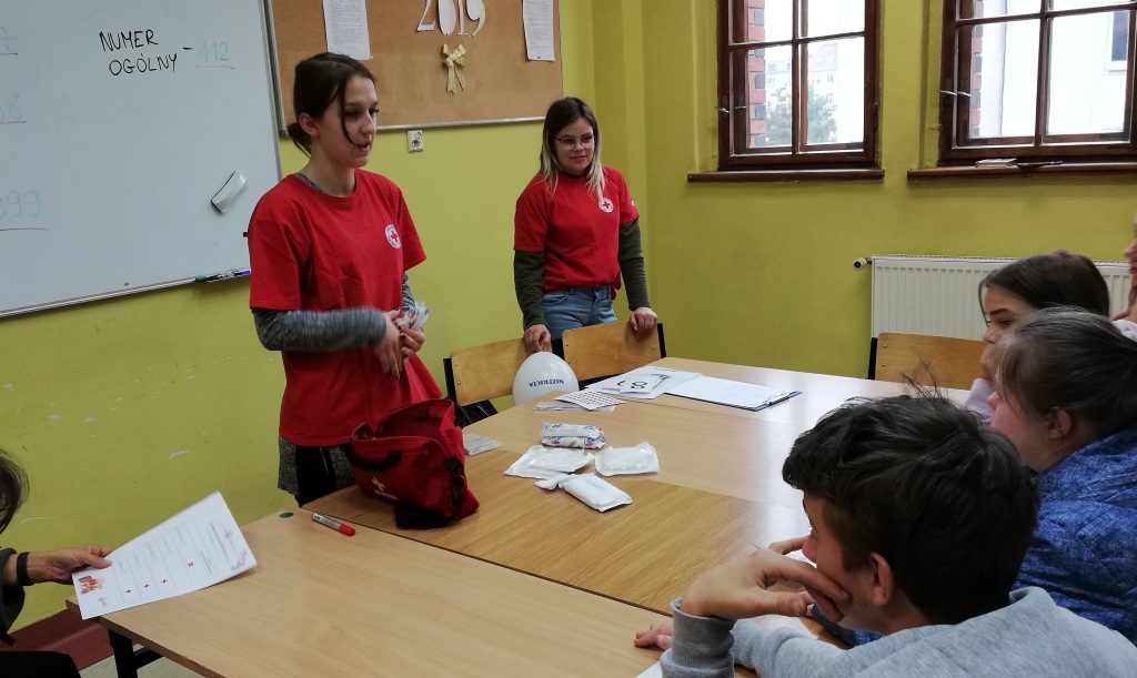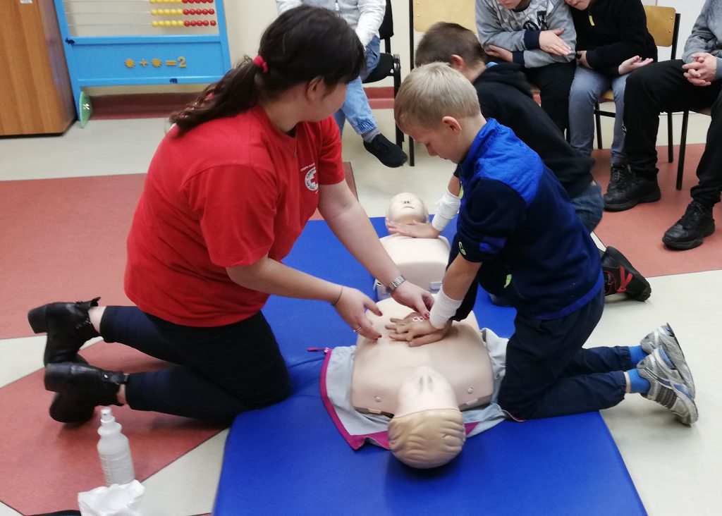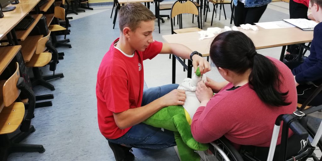 Nasze Szkolne Koło PCK działa pełną parą! Kolejnym naszym przedsięwzięciem była pomoc dla Oddziału Rejonowego PCK w Opolu podczas warsztatów „I ja mogę uratować komuś życie”. Warsztaty z udzielania pierwszej pomocy zorganizowane zostały dla uczniów Zespołu Szkół Specjalnych w Opolu. Nasi wolontariusze uczyli jak postępować z osobą poszkodowaną nieprzytomną oddychająca i nieoddychającą, jak wykonywać opatrunki oraz co powinno znaleźć się w apteczce. Uczestnicy warsztatów mogli poznać zawód policjanta i strażaka, obejrzeć radiowóz i sprzęt strażacki.Całe przedsięwzięcie przebiegało w miłej atmosferze, była to dla nas „żywa” lekcja integracji. Cieszymy się, że mogliśmy wziąć w niej udział.