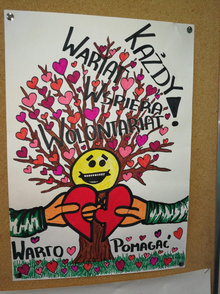 W naszej szkole przygotowaliśmy plakaty i gazetki, które przypominają o działaniach naszych wolontariuszy na rzecz potrzebujących.