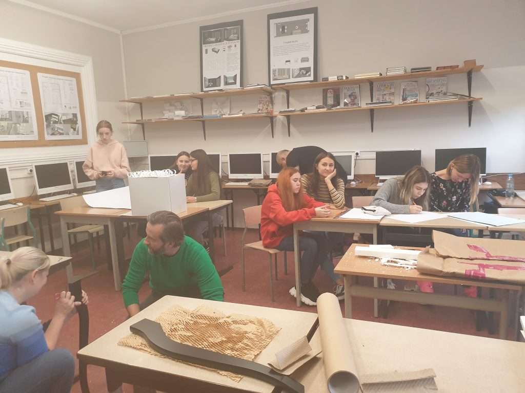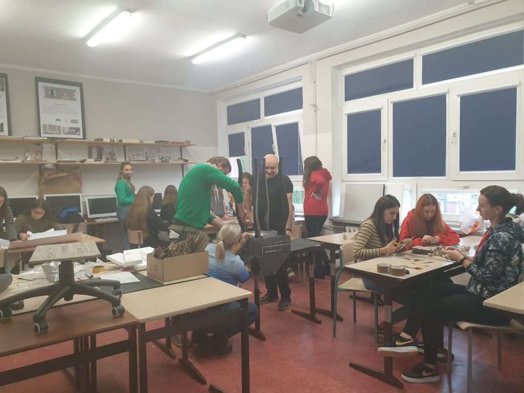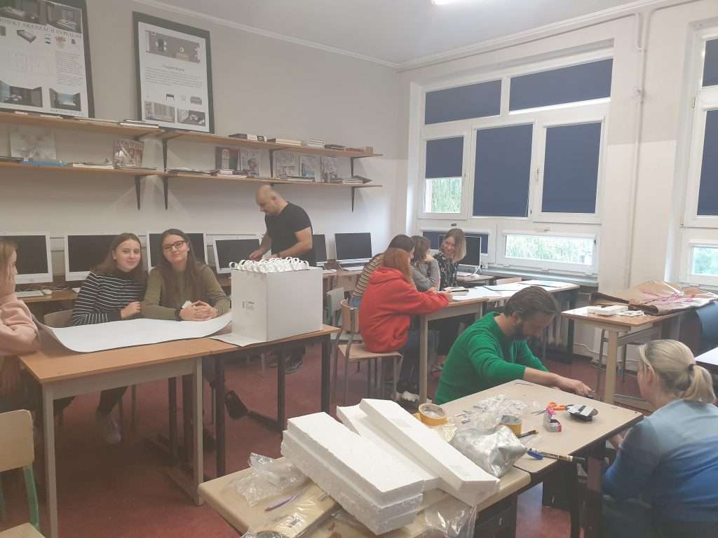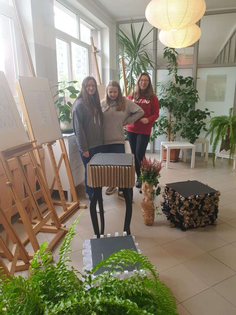 14 października w Dzień Edukacji Narodowej w Zespole Szkół Budowlanych odbyły się warsztaty z aranżacji wnętrz, dotyczące projektowania i wykonywania prototypu mebla. W warsztatach uczestniczyli najlepsi uczniowie klas technikum aranżacji wnętrz z 1TA2 oraz 2TAp. Uczniowie z dużym zaangażowaniem wykonali stolik, dwa siedziska oraz wazon. Ideą warsztatów było stworzenie prototypów mebli z najprostszych materiałów, takich jak kartony i brystole, zatem uczniowie musieli się wykazać dużą kreatywnością i pomysłowością. Uczestnicy warsztatów postawili na kolory monochromatyczne czyli biel, czarny i szary, a całość kompozycji uzupełnili dodatkowo jesiennym bukietem kwiatów. Wykonane modele mebli wystawiono w szkole w holu na drugim piętrze.