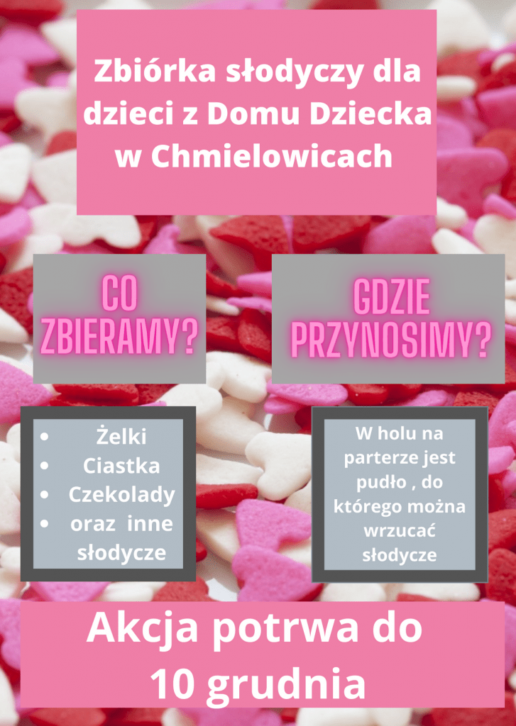 Podczas akcji zbieramy słodycze: czekolady, batony itp. dla dzieci z Domu Dziecka w Chmielowicach oraz środki higieniczne i kosmetyczne: chusteczki nawilżające, balsamy, kremy, dezodoranty itp. dla podopiecznych Domu Pomocy Społecznej Sióstr Franciszkanek w Opolu.
