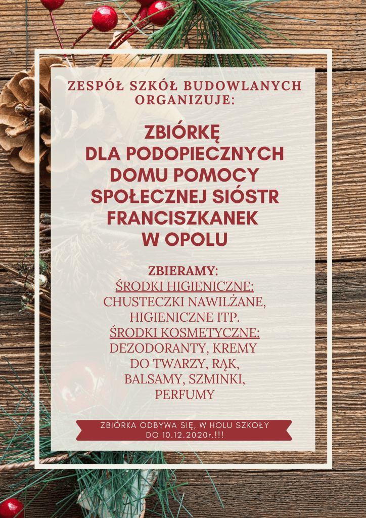 Od 10.11.2020r. do 10.12.2020r. w Zespole Szkół Budowlanych im. Papieża Jana Pawła II w Opolu odbywa się akcja charytatywna pt.: „Świąteczny Dar”.