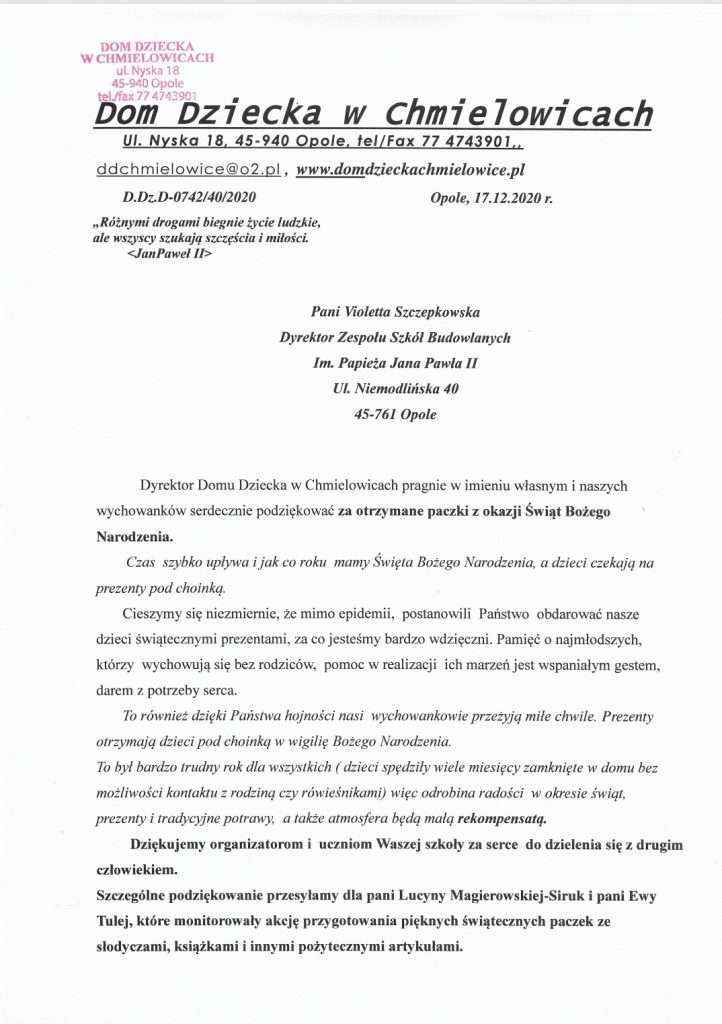 Podziękowanie z Domu Dziecka w Chmielowicach