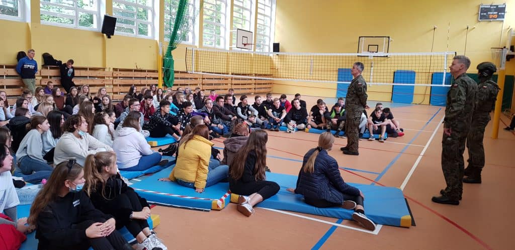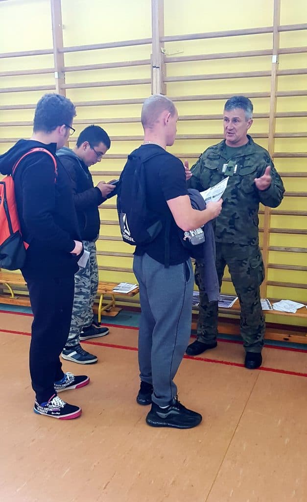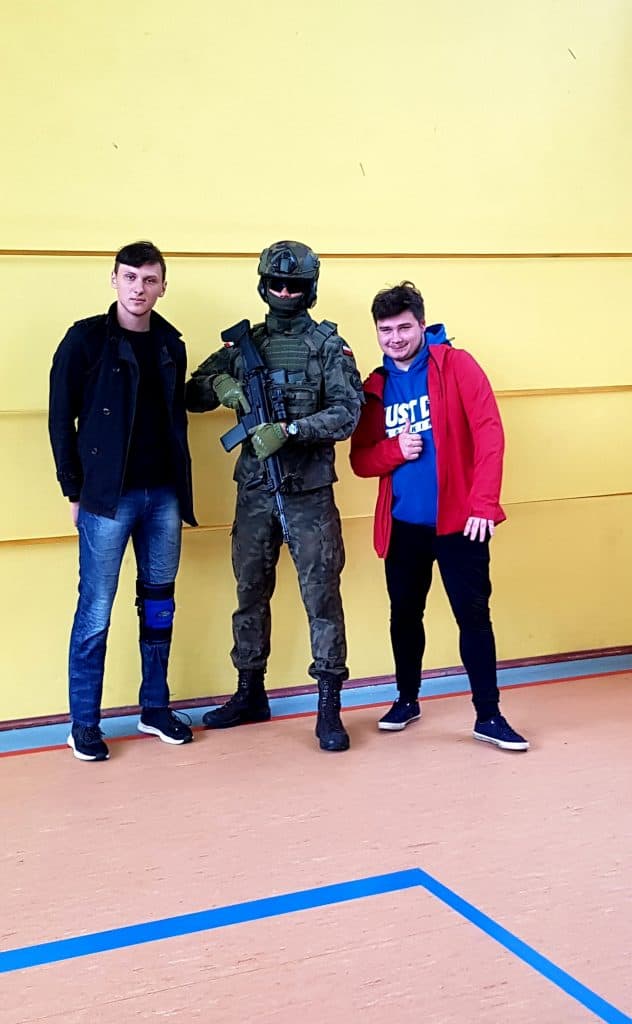 23 września na zaproszenie Hufca Pracy w Opolu naszą szkołę odwiedzili żołnierze Wojsk Obrony Terytorialnej – 171 batalionu lekkiej piechoty w Brzegu. W czasie spotkania młodzież została zapoznana z zasadami rekrutacji oraz warunkami pełnienia terytorialnej służby wojskowej, a także z przysługującymi z tego tytułu licznymi przywilejami. Atrakcją dla uczestników była prezentacja broni i pełnego umundurowania, w jakie wyposażony jest żołnierz, a także możliwość zrobienia sobie pamiątkowej fotografii. Istotną informacją było to, że o przyjęcie w szeregi Wojsk Obrony Terytorialnej mogą ubiegać się także te osoby, które do tej pory nie pełniły żadnej formy służby wojskowej. Młodzież klas trzecich, kończąca Branżową Szkołę I stopnia, nieraz niepewna swojej przyszłości, nie zawsze wie, co chciałaby robić po szkole – dlatego służba w jednostkach WOT jest dla niej jedną z propozycji wartych rozważenia. Tym bardziej, że daje ona możliwość pogodzenia życia rodzinnego i zawodowego ze służbą Ojczyźnie.