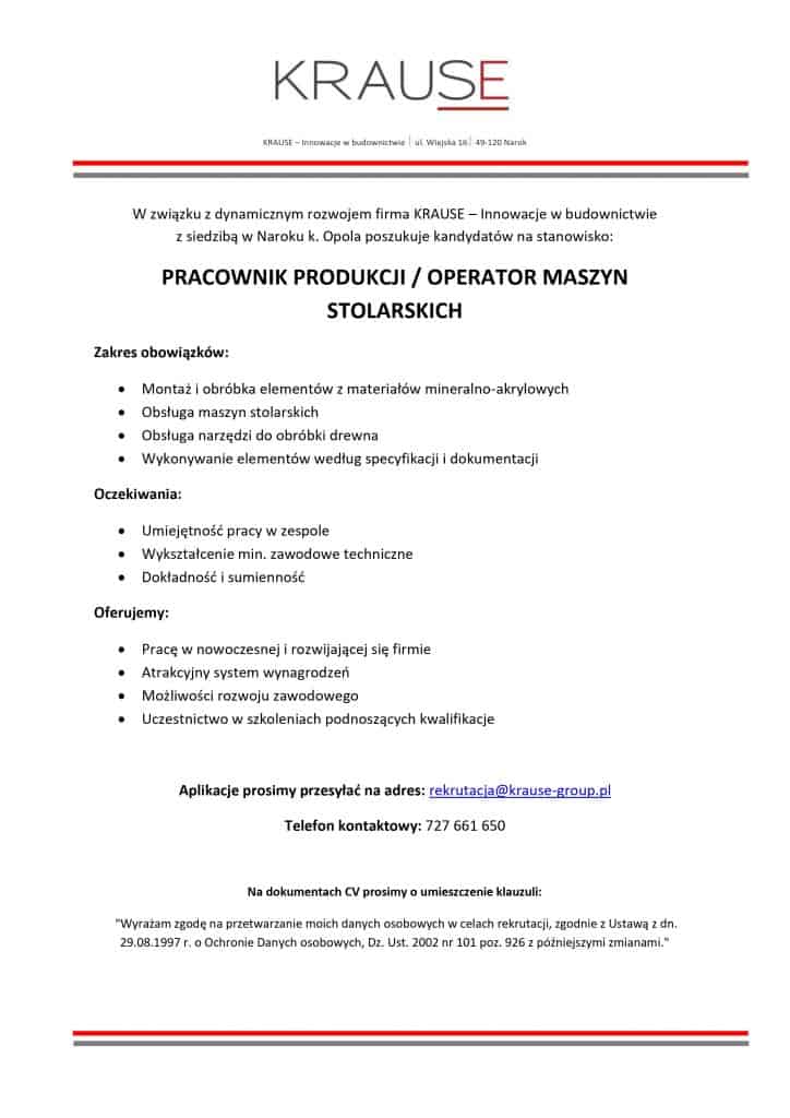 Firma Krause Innowacje w Budownictwie aktualnie poszukuje pracowników produkcyjnych, stolarzy i pomocników stolarza.