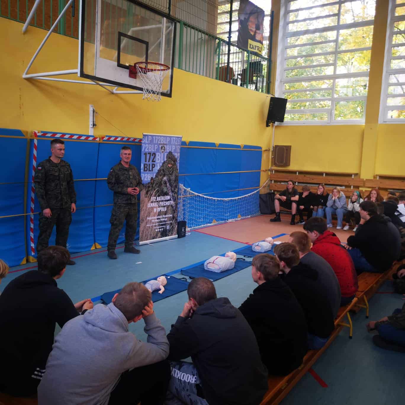 W dniu 05.10.2022 roku pan Stanisław Gaweł z udziałem zaproszonych instruktorów z Wojsk Obrony Terytorialnej 172 batalionu lekkiej piechoty w Opolu zorganizował praktyczne ćwiczenia z „Podstaw pierwszej pomocy medycznej”. W zajęciach wzięli uczniowie z klas 1TA1 i 1TA2. Instruktorzy omówili i pokazali w praktyczny sposób – krok po kroku – poszczególne etapy udzielania pomocy przedmedycznej przy użyciu fantomów. Przeszkolenie miało na celu utrwalenie omówionych na lekcjach wiadomości z przedmiotu „Edukacja dla bezpieczeństwa” oraz nabycie i rozwijanie praktycznych umiejętności udzielania pierwszej pomocy przez uczniów. Być może w przyszłości zaowocuje to uratowaniem chociaż jednego życia ludzkiego…