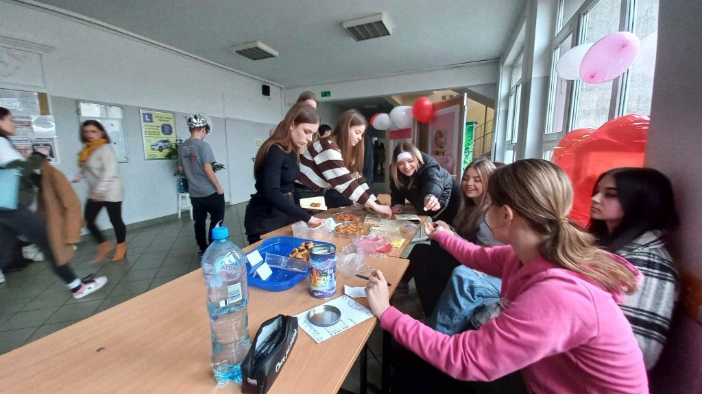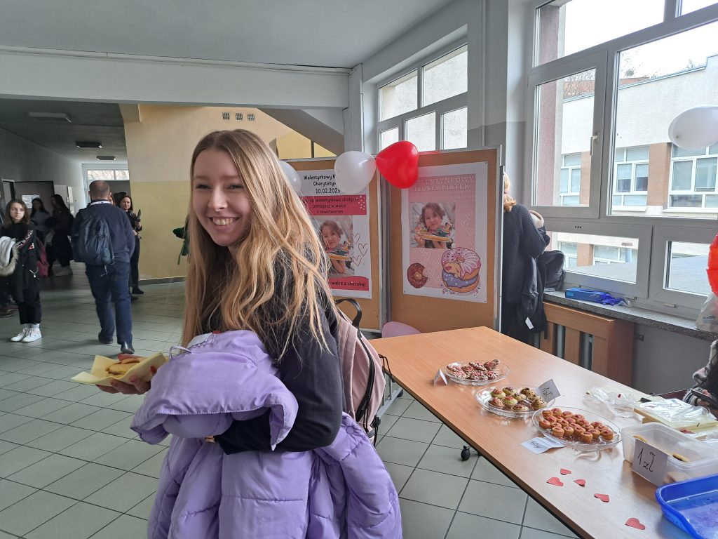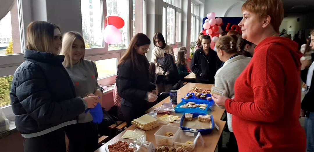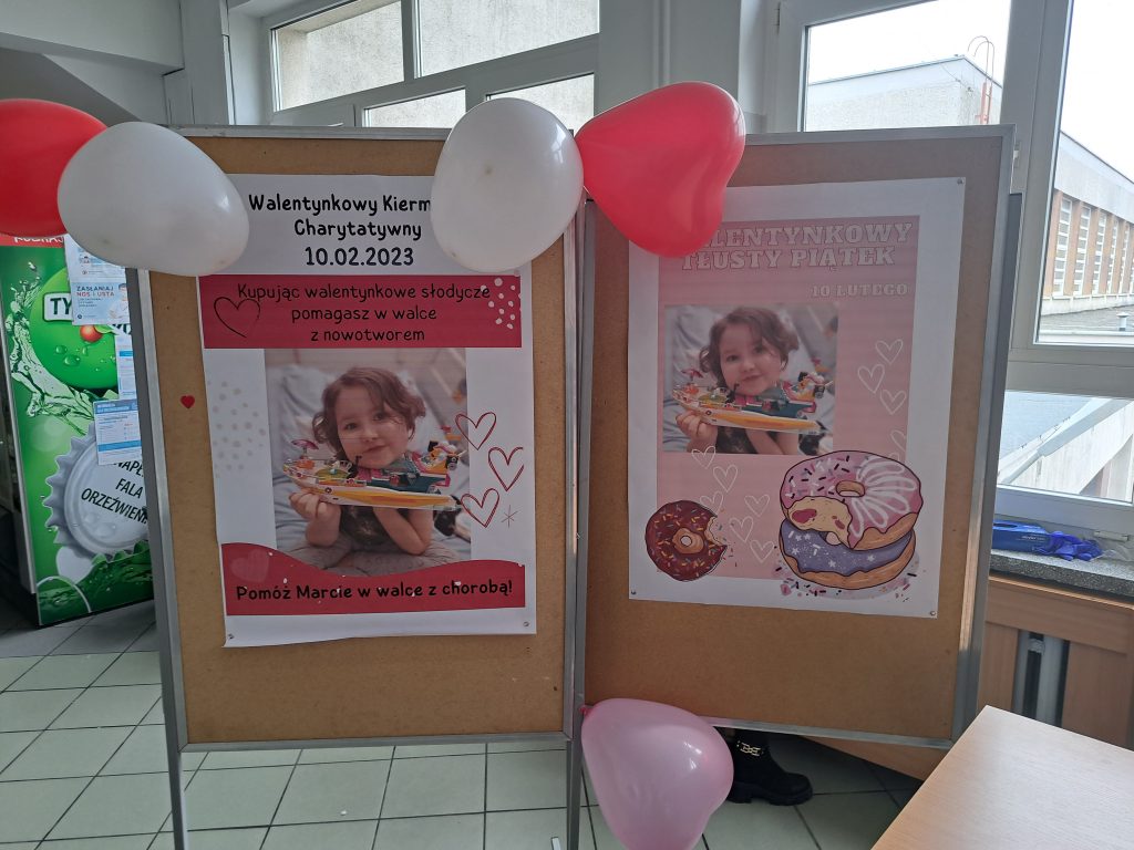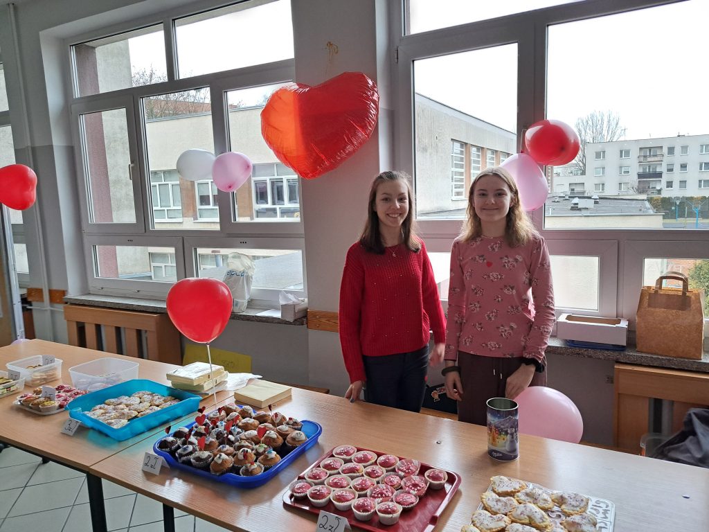 W dniu 10.02.2023r., w naszej szkole odbył się Walentynkowy Kiermasz Charytatywny dla pięcioletniej Marty z Opola. Od samego rana wolontariusze szkolnego koła PCK i koła wolontariatu przygotowywali walentynkowe stoisko ze słodyczami, na którym znalazły się pyszne i słodkie babeczki, ciasteczka i ciasta. Na każdej przerwie uczniowie, nauczyciele i pracownicy szkoły zasilali skarbonkę Martusi kupując walentynkowe wypieki. Cały dochód z akcji 573zł i 30gr został wpłacony na konto dziewczynki!