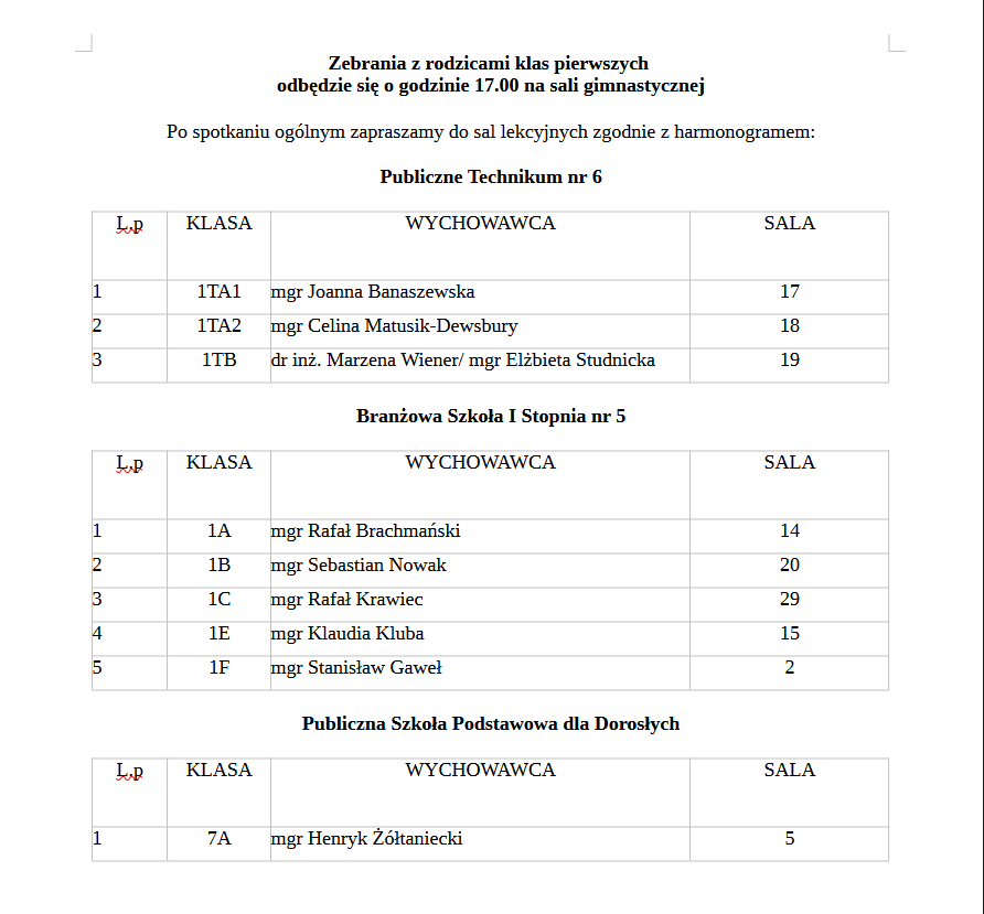 W dniu 07.09.2023r. o godzinie 17.00 na sali gimnastycznej odbędzie się zebranie rodziców klas pierwszych Publicznego Technikum nr 6 oraz Branżowej Szkoły I Stopnia nr 5.