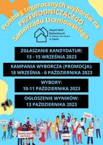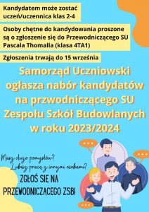 13.09.2023 r, odbyło się I zebranie Samorządu Uczniowskiego, na którym obecny przewodniczący szkoły Pascal Thomalla z klasy 4Ta1, wraz z opiekunem SU – Joanną Sową i Rzecznikiem Praw Ucznia – Magdaleną Kuniec i przewodniczącymi Samorządów Klasowych ustalili terminy kampanii wyborczej na nowy rok szkolny. Zapraszamy wszystkich uczniów do działalności Samorządu Szkolnego, każdy głos i pomysł jest ważny. Następne zebranie SU 27.09.23 r. o godz, 11.15 na sali gimnastycznej.