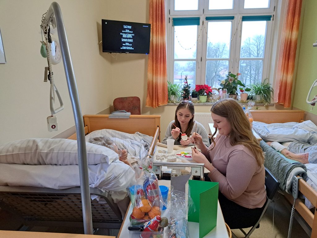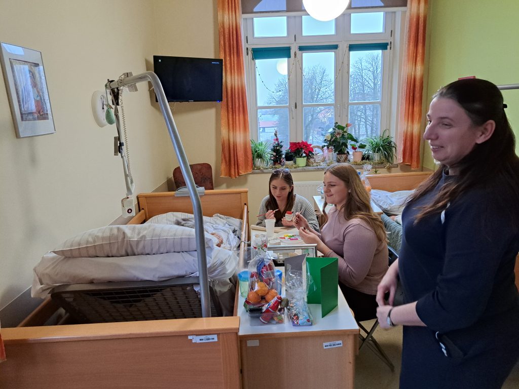 W dniu 14.12.2023 r. wolontariusze z naszej szkoły wraz z p. Elą Studnicką i p. Ewą Tulej odwiedzili podopiecznych hospicjum Betania. Na ręce pani Basi Chyłki koordynatorki wolontariatu w Betanii wręczyliśmy świąteczna choinkę oraz kartkę przygotowana przez naszych uczniów. Pani Basia przedstawiła uczniom specyfikę miejsca, opowiedziała o podopiecznych i zaprowadziła do sal, gdzie mielismy okazję wcielić się w rolę mikołajow i wręczyć d całej społeczności szkolnej kartki świąteczne. Po pierwszym zapoznaniu podzieliliśmy się zadaniami i każdy z nas udał się na warsztaty z podopiecznymi. Justyna, Ania, Laura, Nicol, Wiktor,  Paulina, Oliwia i Celina ozdabiali wraz z podopiecznymi świąteczne odlewy gipsowe, rozmawiając i bardzo miło spędzając czas. Dziękujemy za wspólnie spędzony czas.🎄