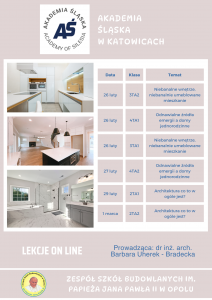 W ramach współpracy z Akademią Śląską zapraszamy serdecznie naszych uczniów do udziału w zajęciach on line prowadzonych przez panią dr inż. arch. Barbarę Uherek – Bradecką.