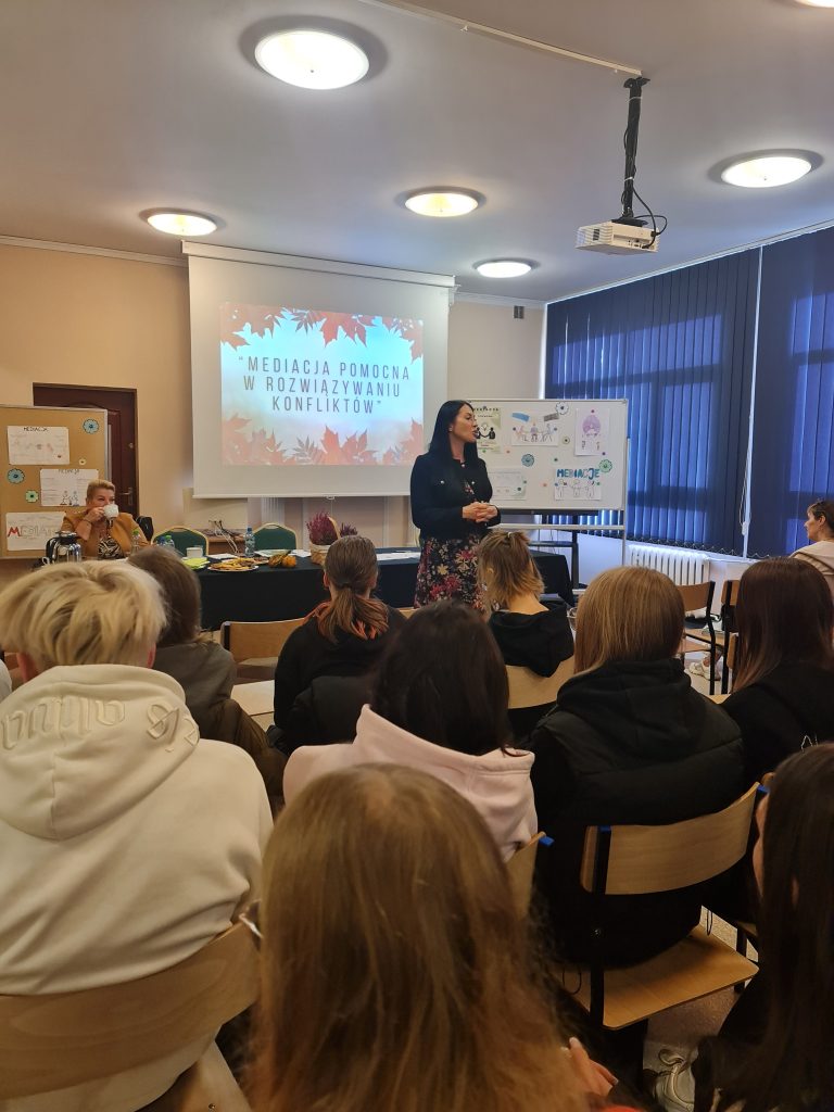 Obie ekspertki w przystępny i interesujący sposób przedstawiły młodzieży klasy 1TB i 1TA ideę mediacji, podkreślając jej zalety i korzyści płynące z rozwiązywania konfliktów w sposób polubowny. Prelekcje były wzbogacone licznymi przykładami z życia, co uczyniło temat bardziej zrozumiałym i bliskim młodym słuchaczom. Pani Bożena Smyczyńska przybliżyła różne rodzaje mediacji, a pani Aneta Rempalska opowiedziała także o postępowaniu sądowym, rozwiewając wątpliwości młodzieży dotyczące procesu sądowego i jego przebiegu.