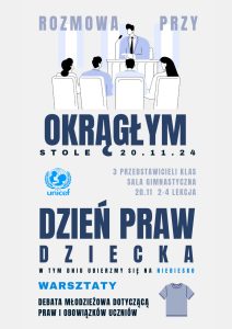 20 listopada, na pamiątkę uchwalenia Konwencji o prawach dziecka, obchodzony jest Międzynarodowy Dzień Praw Dziecka. W naszej szkole już po raz drugi uczestniczymy w tym wydarzeniu. W tym roku skupiliśmy się na Artykule 12. Konwencji o prawach dziecka, który stanowi: „Każde dziecko ma prawo do wyrażania swoich poglądów, uczuć i życzeń we wszystkich sprawach, które go dotyczą, oraz do tego, aby jego poglądy były brane pod uwagę i traktowane poważnie”. Ten artykuł stał się dla nas inspiracją do zorganizowania debaty pt. „Rozmowa przy okrągłym stole” na temat praw i obowiązków uczniów oraz oczekiwań uczniów wobec szkoły.