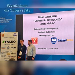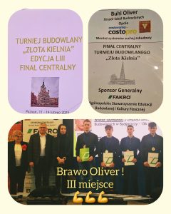 W dniach 11.02.- 14.02. 2025r. w Poznaniu odbył się finał centralny Turnieju Budowlanego ,,Złotej Kielni”. Do finału przystąpili laureaci eliminacji okręgowych w 6 kwalifikacjach. Uczeń naszej szkoły Oliver Buhl zajął 3 miejsce w 53 centralnym finale Turnieju Budowlanego ,,Złota Kielnia”.