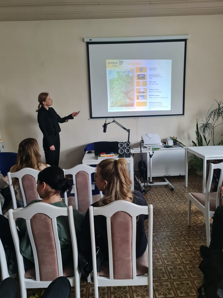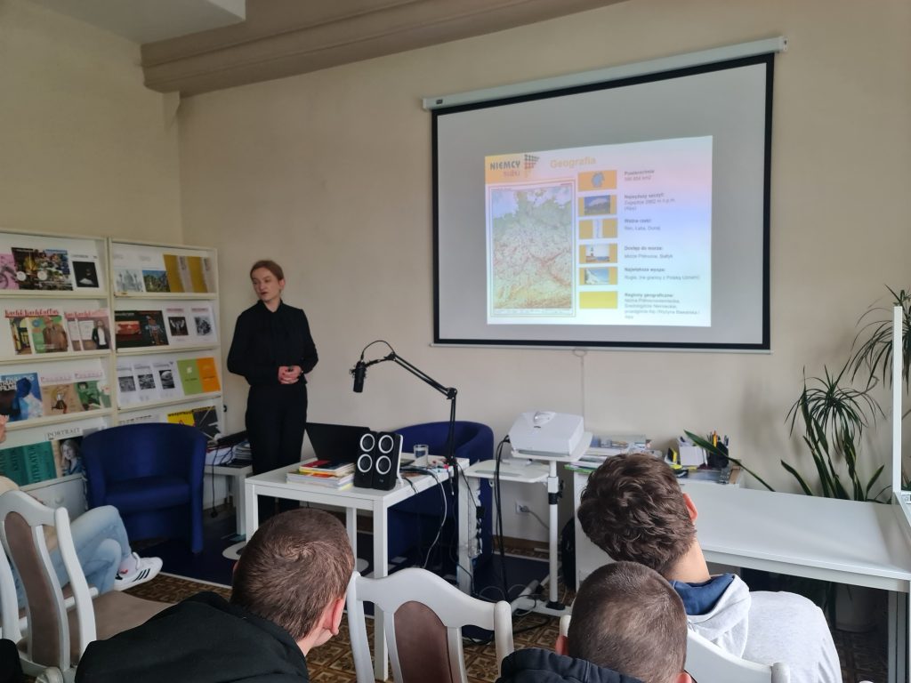 Podczas tej wyjątkowej wizyty uczniowie uczestniczyli w pasjonującym wykładzie poświęconym naszemu zachodniemu sąsiadowi – Niemcom. Prowadząca spotkanie przypomniała najważniejsze informacje o tym kraju oraz poszerzyła wiedzę uczniów o ciekawostki, które nie zawsze pojawiają się w podręcznikach.