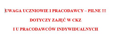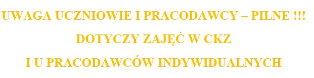 UWAGA UCZNIOWIE I PRACODAWCY – PILNE !!! DOTYCZY ZAJĘĆ W CKZ I U PRACODAWCÓW INDYWIDUALNYCH Praktyczna nauka zawodu i młodociani pracownicy Do 18 kwietnia br. ograniczona będzie praktyczna nauka zawodu organizowana przez szkoły i placówki prowadzące kształcenie zawodowe. Zajęcia z zakresu praktycznej nauki zawodu, w tym zajęcia w formach kursowych, będą prowadzone zdalnie – […]