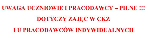 UWAGA UCZNIOWIE I PRACODAWCY – PILNE !!! DOTYCZY ZAJĘĆ W CKZ I U PRACODAWCÓW INDYWIDUALNYCH Praktyczna nauka zawodu i młodociani pracownicy Do 25 kwietnia br. młodociani pracownicy klas I i II branżowych szkół I stopnia nie będą mieli organizowanych zajęć praktycznych u pracodawców. Pracodawca jest zobowiązany zwolnić młodocianego pracownika z obowiązku świadczenia pracy. Na zajęcia […]