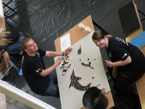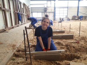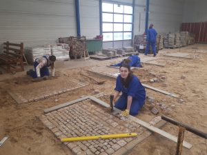 W ramach praktyki uczyliśmy się przede wszystkim żmudnej, ciężkiej, ale efektownej sztuki brukowania – ćwiczyliśmy pomiary niwelatorem, na bazie rysunków technicznych układaliśmy bruk w różnorodnych strukturach. Nauczyliśmy się pracy z kamieniem naturalnym i betonem. Potrafimy ułożyć kostkę na powierzchni płaskiej, umiemy też łączyć ze sobą różne rodzaje kostki. Umiejętności te przydadzą się i w pracy architekta krajobrazu (w wykonywaniu obiektów małej architektury krajobrazu), i aranżera wnętrz (w tworzeniu patia czy tarasu), i budowlańca.