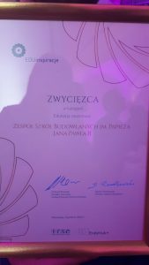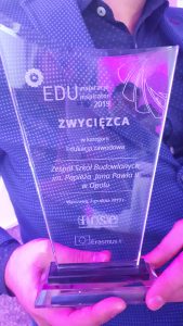 3 grudnia w Zamku Ujazdowskim w Warszawie odbyła się uroczysta Gala wręczenia nagród, na którą wszyscy nominowani zostali zaproszeni. I Gala ta pozostanie na długo w naszej pamięci. Gdy wyczytano nominowanych w naszej kategorii, nasze odczucia krążyły między nadzieją a zwątpieniem. Gdy usłyszeliśmy – „Zwycięzcą w kategorii Edukacja Zawodowa został… Zespół Szkół Budowlanych im. Papieża Jana Pawła II z Opola” nasza radość nie miała końca! Nagrodę wręczył Minister Edukacji Narodowej, Dariusz Piontkowski wraz z Dyrektorem Generalnym Fundacji Rozwoju Systemu Edukacji, dr Pawłem Poszytko. Dyrektor ZSB, Violetta Szczepkowska, z radością podziękowała za to wyróżnienie, zwracając uwagę na to, iż zgodnie z hasłem konkursu „Działam i inspiruję” nauczyciele naszej szkoły są w tych obszarach wyjątkowi.